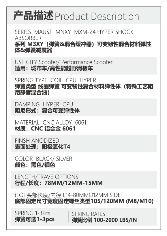 技术点:单双三弹簧压缩式并联结构可提升C型架构车辆稳定性及操控,杜绝车辆高速行驶跳动摇摆,玛希姆运动科技实验室与综合油脂厂定制开发混合抗磨成份油脂消除异响提升减震器持久度面对复杂路况天气提升稳定性,疏水防尘配方,双组份CPU材质可变弹性体提升下压韧性配合线性弹簧消除弹簧硬性压缩触底,10B21/SCM435材质螺栓台资厂定制带有MAUST商标防伪,针对长时间运动改良自润滑轴承为拜尔混合配比材料更耐磨彻底解决运动带来的摩擦噪声,可选配回弹韧性材料/可选台资/内资螺栓/缓冲器可选国产/进口材质。