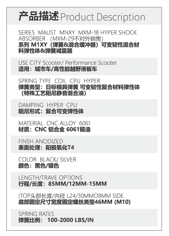 技术点:新型安装固定减震位可减小车身设计尺寸带来更大车辆设计空间提升C型架构车辆稳定性及操控,杜绝车辆高速行驶跳动摇摆,玛希姆运动科技实验室与综合油脂厂定制开发混合抗磨成份油脂消除异响提升减震器持久度面对复杂路况天气提升稳定性,疏水防尘配方,双组份CPU材质可变弹性体提升下压韧性配合线性弹簧消除弹簧硬性压缩触底,10B21/SCM435材质螺栓台资厂定制带有MAUST商标防伪,针对长时间运动改良自润滑轴承为拜尔混合配比材料更耐磨彻底解决运动带来的摩擦噪声,可选配回弹韧性材料/可选台资/内资螺栓/缓冲器可选国产/进口材质