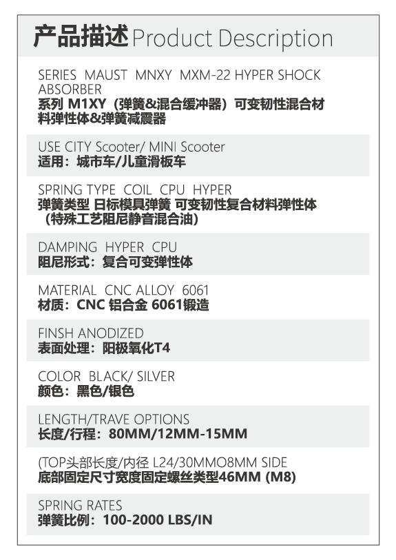 技术点:新型安装固定减震位可减小车身设计尺寸带来更大车辆设计空间提升C型架构车辆稳定性及操控,杜绝车辆高速行驶跳动摇摆,玛希姆运动科技实验室与综合油脂厂定制开发混合抗磨成份油脂消除异响提升减震器持久度面对复杂路况天气提升稳定性,疏水防尘配方,双组份CPU材质可变弹性体提升下压韧性配合线性弹簧消除弹簧硬性压缩触底,10B21/SCM435材质螺栓台资厂定制带有MAUST商标防伪,针对长时间运动改良自润滑轴承为拜尔混合配比材料更耐磨彻底解决运动带来的摩擦噪声,可选配回弹韧性材料/可选台资/内资螺栓/缓冲器可选国产/进口材质。