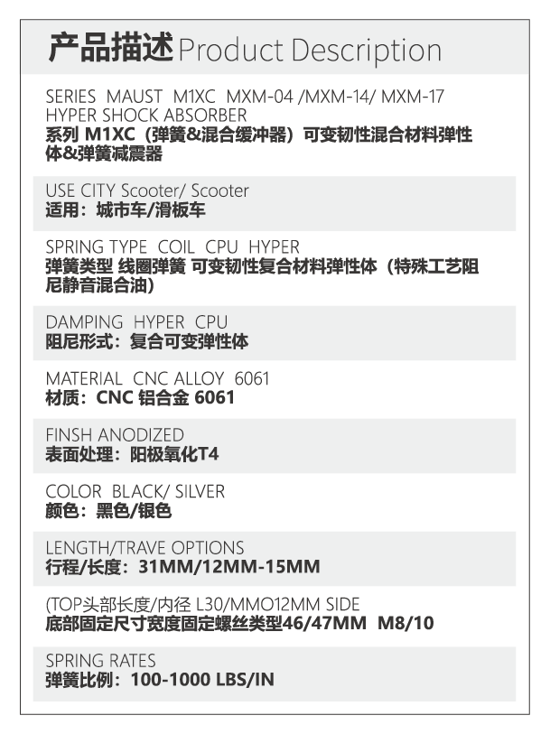 技术点: 单弹簧抽拉式结构可提车辆舒适度MXM-04/MXM-14专为童车设计制造MXM-17专为大型成人越野车设计更高性能更高稳定性,玛希姆运动科技实验室与综合油脂厂定制开发混合抗磨成份油脂消除异响提升减震器持久度面对复杂路况天气提升稳定性,疏水防尘配方,双组份CPU材质可变弹性体提升下压韧性配合线性弹簧消除弹簧硬性压缩触底,10B21/SCM435材质螺栓台资厂定制带有MAUST商标防伪,针对长时间运动改良自润滑轴承为拜尔混合配比材料更耐磨彻底解决运动带来的摩擦噪声,可选配减震发明专利中发电减震配置/可选配回弹韧性材料/可选台资/内资螺栓/缓冲器可选国产/进口材质。